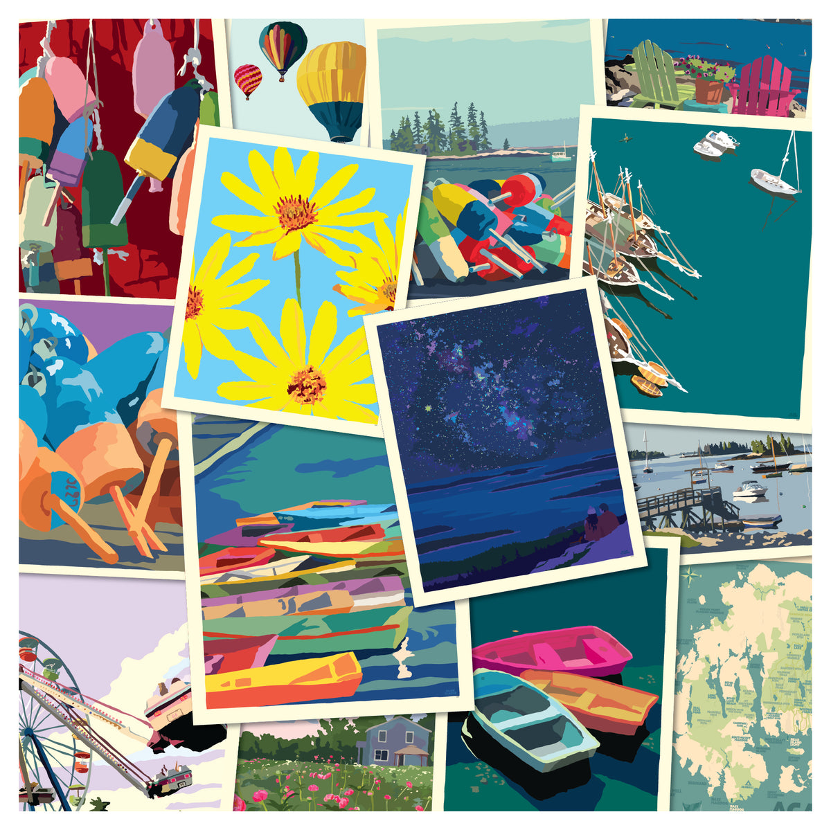 Down East Magazine's Best Art Gallery In Maine 2025 Winner! Overlooking the Kennebec River, the Alan Claude Gallery is located in historic downtown Gardiner. Alan Claude's Poster Style art of lighthouses, coastal and lake scenes of Maine and other New England states are boldly displayed in the artist's beautifully restored buildings and gallery. Alan Claude's Maine Calendar series are among one of the most popular gifts for visitors and locals alike. Other items include coasters, stickers and notecards.